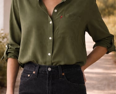 This olive button-up is designed for movement and intention — soft against the skin, relaxed through the body, and quietly composed. The drape is effortless, the structure subtle, creating a balance that feels lived in rather than styled.